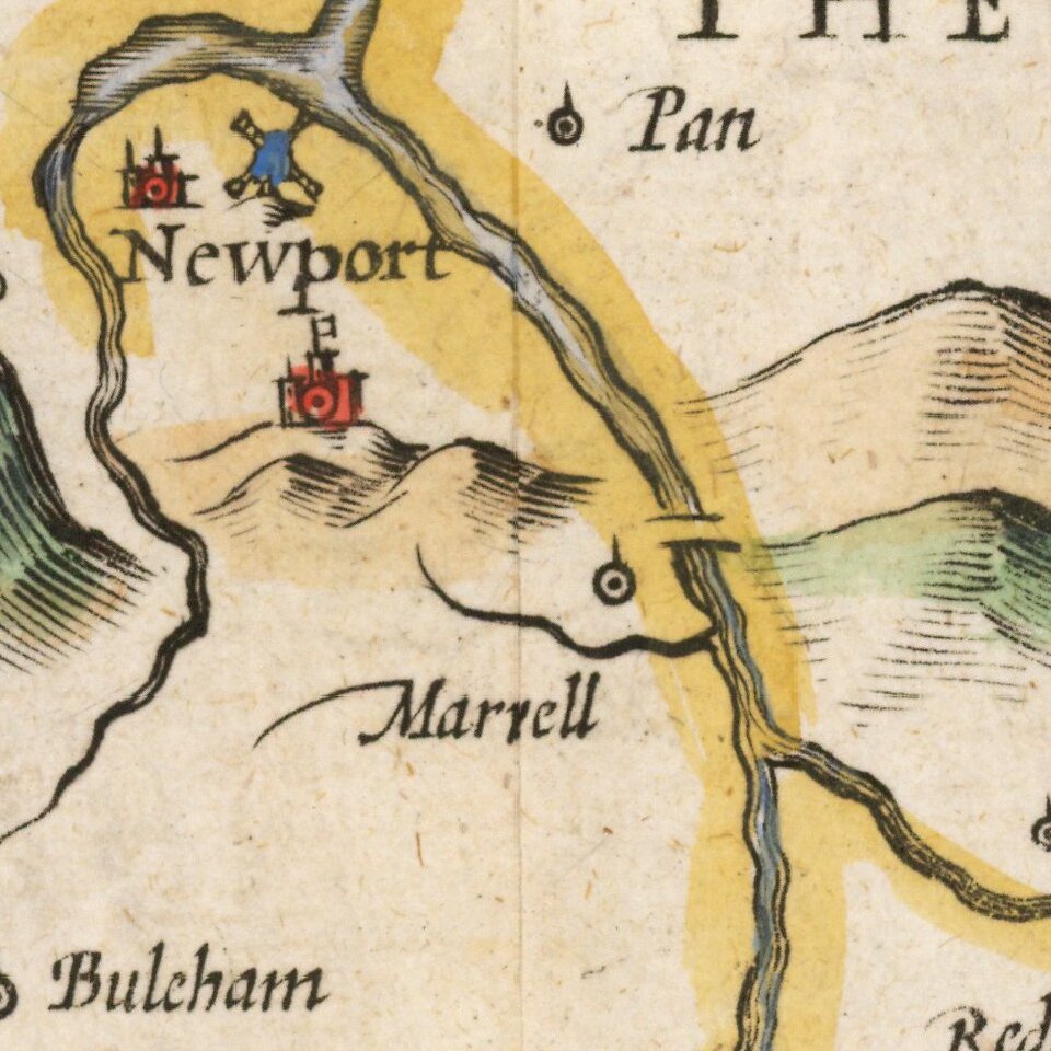 A nice full color example of Speed's map of the Isle of Wight, including coats of arms and a detailed town plans of Southampton and Newport.