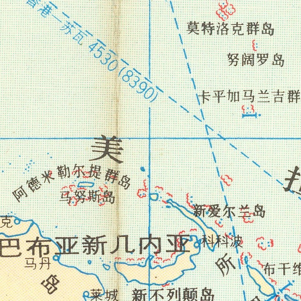 The map is delicately mostly colored in attractive pastels, with China being colored slightly more brightly and in red. Rivers, oceans, and mountains are all named. Railways are shown on land and shipping lanes at sea. Many other details are provided. In all, this a very interesting and accurate mid-century world map produced in China.